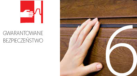 Konstrukcja bram segmentowych zapewnia zabezpieczenie przed: • przycięciem palców; • zaczepieniem i skaleczeniem; • niekontrolowanym ruchem płaszcza; • opadnięciem płaszcza przy usterce sprężyny Bramy odpowiadają wymaganiom europejskim EN 12604, EN 12453, EN 12424, EN 12425, EN 12426.