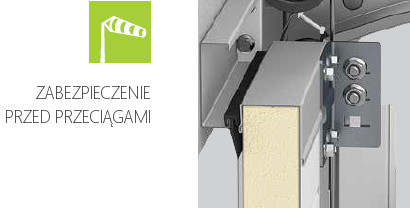 Nasze bramy są na całym obwodzie wyposażone w uszczelniacze z nowoczesnych materiałów polimerowych, które dobrze znoszą spadki temperatury. Elastyczne uszczelniacze zapewniają niezawodne uszczelnienie otworu. Innowacyjna konstrukcja wsporników bocznych umożliwia regulację płaszcza bramy w celu uniknięcia niepożądanych strat ciepła.